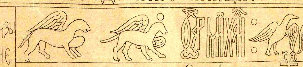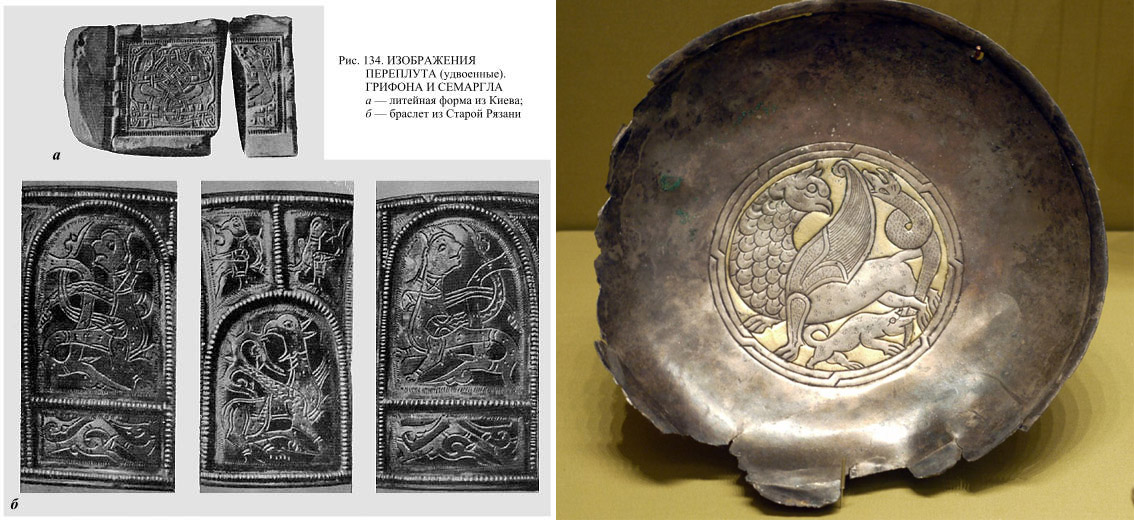 Vpravo: Gryf a Semargl (suzdalské vrata, 13. století)