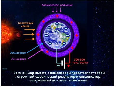 Povrch Země a okolní vrstva ionosféry (nejhustší Heavisideova vrstva ve výšce 100 -120 km) tvoří dvě koule umístěné jedna v druhé, přičemž dutina mezi nimi je ohraničena vodivými povrchy. Takový systém se ve fyzice nazývá kulový kondenzátor. Rozdíl potenciálů mezi koulemi zemského kondenzátoru dosahuje statisíců voltů.