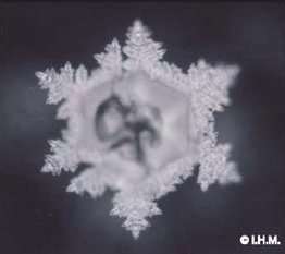 Dvě fotografie ze série vodních krystalů „Dechu ZeměTM“ utvořeného z lávou zahřívané páry na havajském Velkém ostrově. Obrázek nalevo ukazuje srdce, ve kterém jsou dvě dýky. Vzhled a úhel dýk připomíná zednářské symboly. Obrázek napravo napodobuje symbol jin/jang, ale zdá se, že je obklopen lemováním, které se podobá vejcovodu na průřezu při mikroskopickém (histologickém) vyšetření. Teorie doktora Masaru Emota je, že voda je božská, uvědomělá a vnímavá a touží po neustálém spojení s námi, přičemž demonstruje a odhaluje LÁSKU.