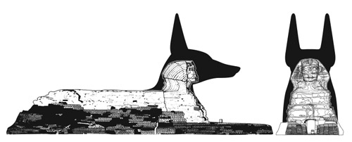 Sfinga se krčí u vchodu do nekropole jako hlídač. A je to! Je to hlídací pes! Starověcí Egypťané měli psa, který se jmenoval Anup (též Anubis), což byl krčící se divoký pes, obecně známý jako šakal (ačkoliv přesně vzato, v Egyptě nebyli žádní šakalové a Anup byl opravdu dnes již vyhynulým druhem divokého psa). Anup byl strážcem nekropole, strážcem mrtvých a byl často zobrazován v přesné poloze Sfingy – a také báječně ve formě sochy nalezené v hrobce Tutanchamona – takže je jeho obraz znám téměř komukoliv, kdo kdy projevoval zájem o starověký Egypt.