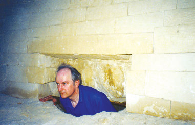 Většina lidí, které zaujali egyptské záhady, byla dlouho zvědavá, zda může být pod Sfingou nějaká tajná komora. Prolézal jsem vnitřek Sfingy a popsal jsem tunel, který existuje v zadní části těla Sfingy, a stejně tak i vertikální tunel vytesaný ze skalního podloží pod její zadnicí a vše jsem zdokumentoval. Na obr. níže vidíte fotografii, kterou pořídila Olivia. Jsem na ní já a moje hlava trčí Sfinze ze zadku, což možná dokazuje, jak dobře ji znám.