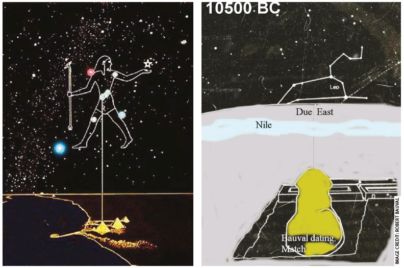 A bylo toho i více. Zjistili, že právě k tomuto datu se tři velké pyramidy v Gíze na nebi téměř dokonale vyrovnaly podél tří hvězd Orionova pásu. To nemohla být pouhá náhoda. Souhvězdí lovce Oriona je považováno za nesmírně důležitou součást staroegyptských systémů náboženského přesvědčení; Orion představoval Osirida, egyptského boha smrti a znovuzrození. Zdá se, že památky a stavby nekropole v Gíze, jmenovitě Velká sfinga a tři pyramidy, byly záměrně rozmístěny v souvislosti s polohou řeky Nil (která se nápadně podobá Mléčné dráze) tak, aby byla uchována, připomínána nebo oslavena konkrétní data nebo okamžiky v čase, aby zrcadlila nebesa nad námi vytvořením schématu nebo uměleckého vyjádření jejich přesného vzhledu nad Zemí v době 10 500 let př. n. l.