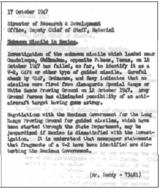 Vyšetřování neznámé rakety, která dopadla poblíž Guadeloupe 12. října 1947, dosud nevedlo k identifikaci jako V-2, GAPA nebo jiný typ řízené střely. Pečlivá kontrola provedená USAF, Ordnance a Navy naznačuje, že 12. října 1947 nebyly z Alamogordo Special Range ani White Sands Proving Ground odpáleny žádné rakety. Armádní pozemní síly vyloučily možnost, že by se jednalo o zbloudilý protiletadlový cíl. Jednání s mexickou vládou o Long Range Proving Ground pro řízené střely, která byla zahájena prostřednictvím Ministerstva zahraničí, mohou být ohrožena, pokud Mexiko nebude s vyšetřováním spokojeno. Je zřejmé, že novinové zprávy o identifikaci fragmentů V-2 znepokojují mexickou vládu.4 Z popisu toho, čím raketa není, a z poznámky autora memoranda, pana Roddyho, lze logicky vyvodit, že konvenční vysvětlení je velmi nepravděpodobné a že se obává, že mexická vláda neuvěří novinám, které tvrdí, že se jedná o raketu V-2. Ať už je povaha této „neznámé rakety” jakákoli, její identita se zřejmě nikdy nevyřešila; nebo pokud byl incident vysvětlen, fakta zůstávají v současné době mimo veřejnou doménu. (Přepis níže uvedené fotokopie dokumentu).