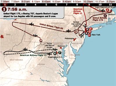 09.36 A.M. "Let 93" se stáčí k Washingtonu. Přibližně o dvě minuty později "Let 77" křižuje přes nejvíce bezpečnostně sledovaný vzdušný prostor na světě a dělá to přitom v okamžiku nejvyššího možného stavu pohotovosti a naráží do nově modernizované částí Pentagonu!!! (Všimněte si prosím, že na grafice je část "Letu 77" uvedena přerušovanou čárou. Podle mne to má označovat tu část letu, kdy byl vypnutý transponder. Ale ten byl vypnutý u všech čtyř letadel. Tak proč nebyly ony části letových tras s vypnutým transponderem u ostatních letů také zobrazené přerušovanou čárou? Jedním z důvodů pro použití čárkované linie bylo u čtenáře vytvořit dojem, že toto letadlo nemohlo být sledované a tak vytvořit důvod k tomu proč obyčejné komerční letadlo mohlo proletět přes nejpřísněji střežený vzdušný prostor na světe. Ale podle mne existuje ještě jeden důvod. Většina trasy tohoto letu v přerušované grafické sekvenci může ukazovat na úsek kdy "Let 77" již neexistoval, pozn. J.CH.).