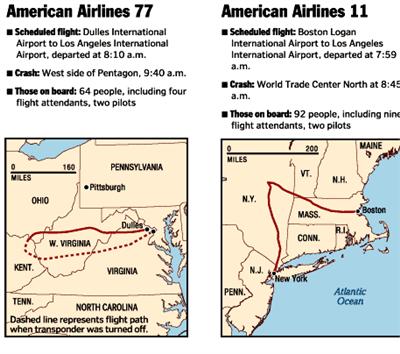 08.20 A.M. - šest minut po prvních technických potížích letu č. 11 se objekt stáčí mimo kurz (nevede tedy již na Manhattan, ale k severní části New York, jako kdyby šlo o čas (viz. příslušná grafika). V této chvíli FAA začíná mít silné podezření o tom, že tento let byl unesen. Ve stejné chvíli American Airlines Flight č. 77 z Washingtonu do Los Angeles startuje z mezinárodního letiště v Dulles. I zde zjišťujeme, že je bezmála tří čtvrtě míst v letadle volných. Letoun se zvedá ze země zhruba 10 minut po jeho plánovaném startu.