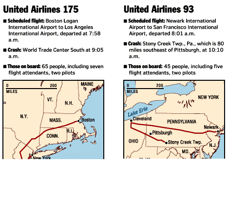 Dobrá, pojďme se tedy pustit do komplexní analýzy. Začneme časovou linií důležitých a veskrze klíčových okamžiků onoho osudového rána. Pro lepší názornost a pochopení budeme používat grafiku, která byla před třemi lety použita novinami Washington Post a Time magazine. Chtěl bych poznamenat, že vypsaný čas odletu označuje plánovaný čas a nikoliv skutečný čas odletu.