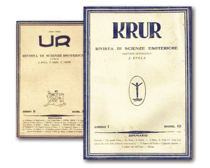 A konečně je tu řada článků, jimiž Evola naplnil čísla KRUR. Některé z nich předjímaly jeho budoucí knihy: "Hermetická tradice", "Tajemství grálu" a "Vzpoura proti modernímu světu". Jiné měly podíl na ustavení jeho filosofického postoje, který nemusel být nutně sdílen všemi členy skupiny. V té době byl již v kontaktu s René Guénonem, jehož dílo potvrdilo Evolovu víru v prapůvodní tradici, pravděpodobně arktického původu, z níž vycházejí všechna dnešní náboženství, více či méně zasažená vlivem času. Zásadní neshoda se týkala Guénonova vyvyšování bráhmanů neboli kněžské kasty, která je nositelem duchovní moci nad kastou kšatrijů neboli královskou kastou mající světskou moc. Pro Evolu byla tato kasta nadřazená, protože jejím ideálem byla akce spíše než kontemplace. Mezi jeho vzory patřil nebeský císař v Číně, předbráhmanská Indie, starověké severské národy, jejichž králové byli „z krve Ásů“ (bohů), a římští císaři, kteří zároveň plnili funkci nejvyššího kněze (pontifex maximus). Ať už na tom dnes někomu záleží, nebo ne, je to v souladu s pátráním skupiny UR po „absolutním individuu“, který mysticky nesplyne s božstvím, ale zachovává si svou (a vždy je to „jeho“) individualitu jako moc, která je nadřazena dokonce i bohům.
