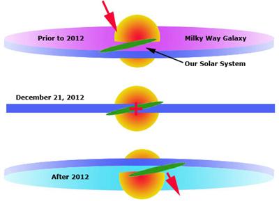 Naše sluneční soustava je součástí obrovské kumulace hvězd a planet, která má tvar disku a říká se jí Mléčná dráha. My se nacházíme někde na okraji disku, lépe řečeno na vršku úzkého disku. Avšak velice brzy se přestěhujeme do spodní části disku. Tato změna, shora dolů, začíná 21.prosince 2012. Ano, přesně tak. V tentýž den, kdy se naše Slunce ocitne na svém solárním maximu, se stane něco, co se ještě nikdy předtím nestalo - ekliptika naší sluneční soustavy se protne s Galaktickou rovinou, nazvanou "Galaktický Rovník" Mléčné dráhy! (viz.obr.dole)