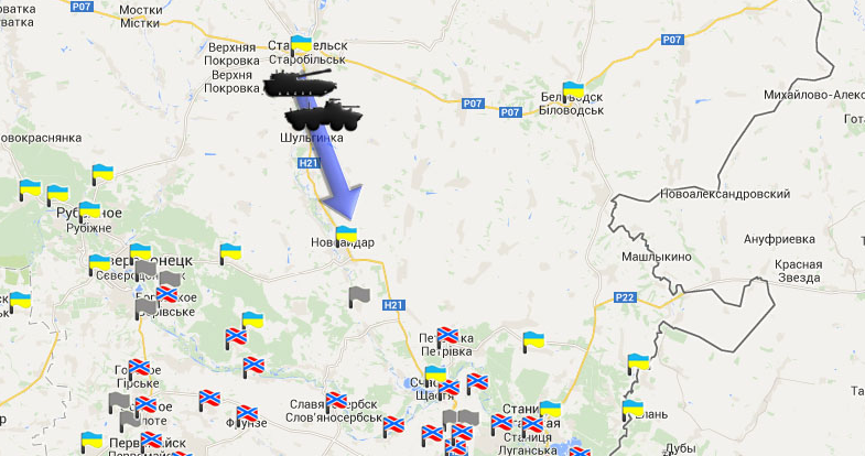 Existují informace (které je potřeba ještě oveřit), že se přes měto Starobilsk ve směru na Luhansk pohybuje kolona obrněných vozidel ukrajinské armády, která je složená z "APU" a trestního praporu "Aidar" (viz obr. níže).