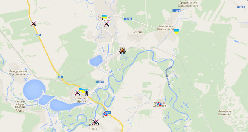- v lokalitě městečka Счастья (Štěstí) probíhají boje. Веселая Гора (Veselá hora) je stále sporným teritoriem (viz obr. níže).