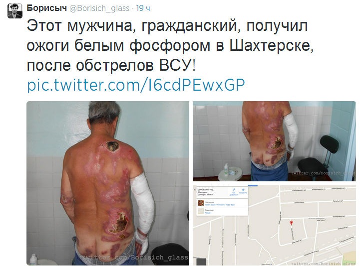 Ukrajina tvrdí, že v žádném případě nepoužívá zakázané bojové prostředky jako například tzv. "bílý fosfor", jak je ale možné, že muž na snímku níže byl zasažen právě touto látkou během bombardování města Šachťorsk ukrajinskou armádou?