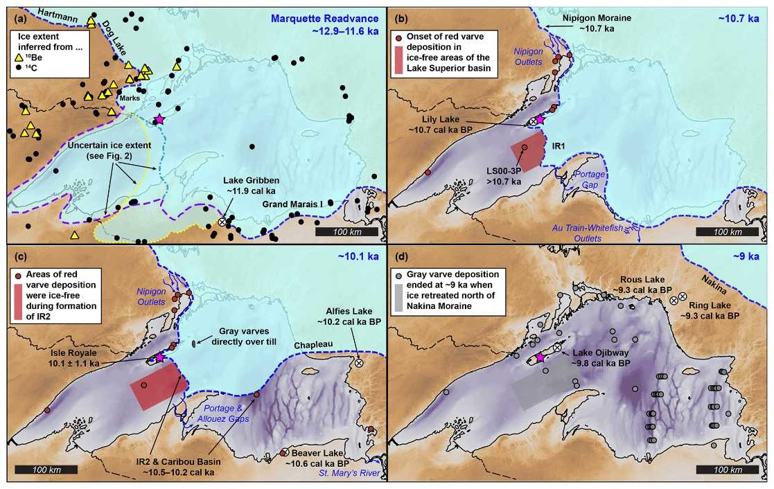 Nedávné analýzy fáze ústupu ledovců určily, že místa u severního pobřeží Isle Royale byla odhalena táním ledovců během raného holocénu. Sledováním základních změn v ukládání varv se výzkumníkům podařilo určit geochronologii období opětovného postupu ledovcového okraje Velkých jezer trvajícího od 12 900 do 11 600 let před současností, po kterém následoval ústup ledovce od 10 700 do 10 100 let před současností (viz. obr. níže).