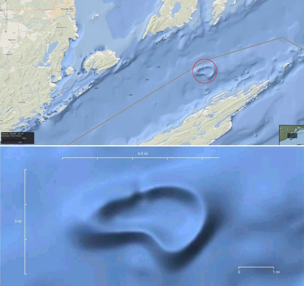 Bathymetrická data NOAA pro danou lokalitu ukazují, že nejvyšší části prstencové struktury dosahují hloubky -52 m, zatímco vnitřní prohlubeň klesá do hloubky -136 m a vnější dno jezera se svažuje až do hloubky -160 m. Nepravidelné údaje o hloubce poskytované funkcí přejíždění myší po mapě pro různé body podél prstencové formace neodpovídají hladkým konturám naznačeným bathymetrickými snímky reliéfu. To naznačuje, že přesné údaje o hloubce byly zkresleny, aby zakryly hladké kontury těchto impozantních umělých struktur.