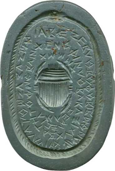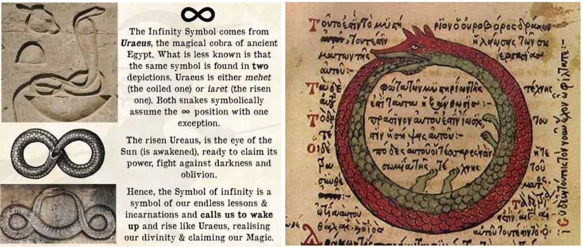 Řecké složené slovo „ouro-boros“ znamená „požírač ocasu“; odkazuje na škodlivé účinky buněčného stárnutí a fyzické smrtelnosti jako na prosazování primárního požadavku Stvořitele na adepty – že alchymistické elixíry musí být konzumovány, aby bylo dosaženo fyzické dlouhověkosti a regenerace z jaderných zdrojů energie RaS. Mezi artefakty vykopané ze starověkých lokalit v Egyptě, které nesou motiv ouroborosu, patří skarabeus s řeckým textem ovinutým kolem centrálního skarabea (výše). Tyto klíčové symbolické asociace podtrhují formativní vliv egyptských tradic na kosmologii Ptolemaiovské říše.