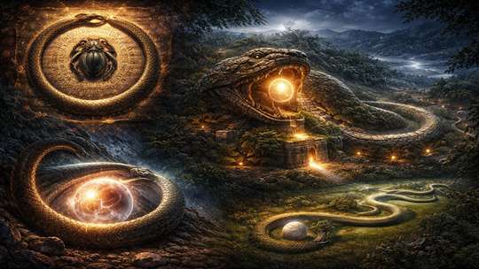 Cykly a věčnost: Nekonečná smyčka hada ztělesňuje severské chápání cyklického času, kde konce vedou k novým začátkům, odrážející roční období a život/smrt/znovuzrození.