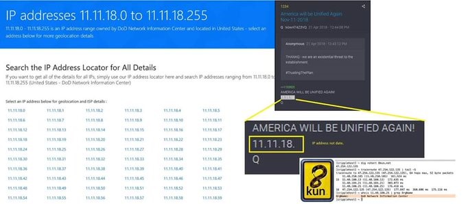 Link na Twitteru byl na tweet od Clarka Petrounova, který tvrdí, že první, co ho napadlo, byl odkaz na datum v postu Q Anona, z 11.11.18, což je IP adresa patřící the "Department of Defense Network Information Center" (Síťového informačního centra ministerstva obrany). Naznačuje se, že vojenské servery jsou nějak zapojeny do hostingu kanálu 8kun, prostřednictvím kterého začal Q opět postovat poté, co byl původní kanál 8chan zavřen kvůli tomu, že různé internetové společnosti jeho hosting na svých cloudových serverech odmítly.