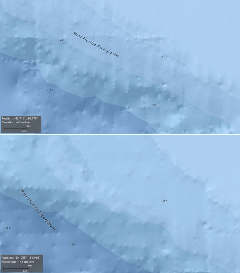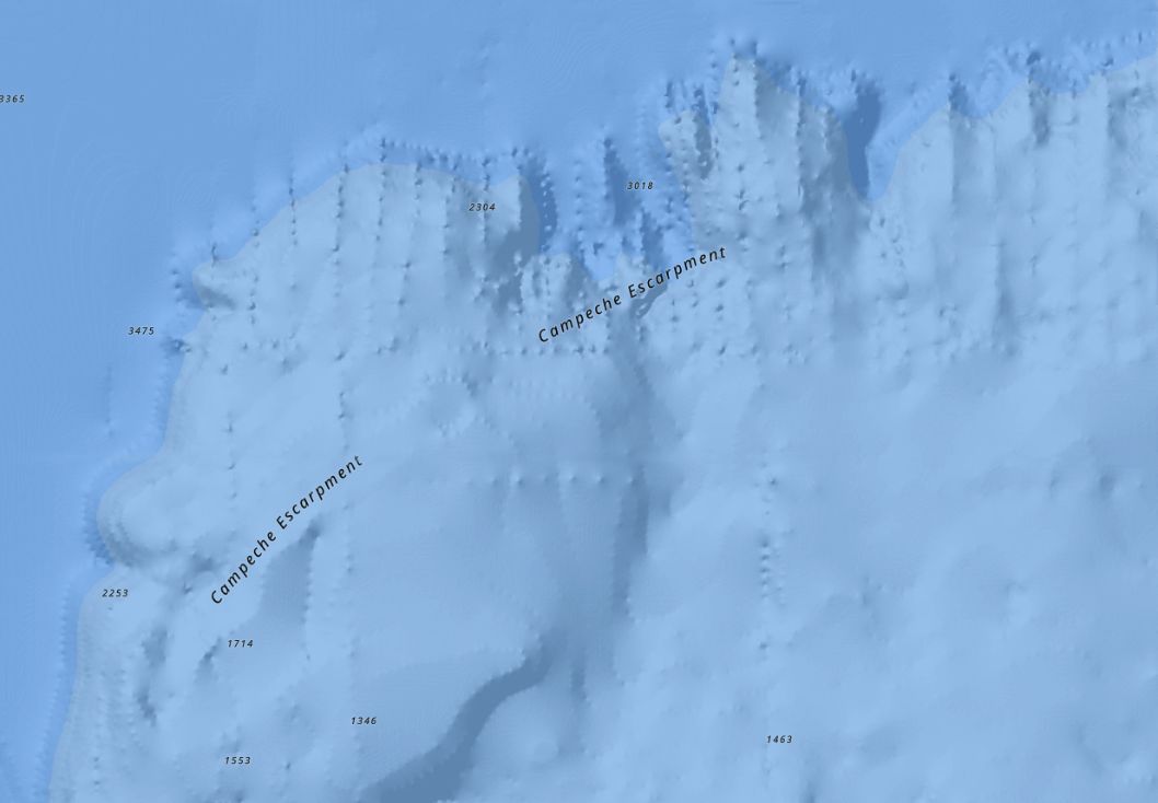 Na batymetrických mapách s vysokým rozlišením na útesu Campeche, který se nachází u severního pobřeží poloostrova Yucatán, lze pozorovat mnoho paralelních linií tvořených stovkami mořských jam a mohyl na dně (viz. obr. nahoře). Na první pohled budí tato lineární rozšíření topografických prvků dojem jakéhosi digitálního artefaktu nebo zkreslení nějakého druhu. Bližší zkoumání dat však tuto odmítavou domněnku popírá. Tyto paralelní řady mohyl byly nepochybně identifikovány a zkoumány americkou a mexickou vládou, přestože o jejich existenci zcela mlčí. Těchto typů záhadných struktur si všimlo mnoho badatelů z oceánografické komunity, ale nikdo z nich nebyl ochoten se jimi přímo zabývat v žádné vědecké publikaci jakéhokoli druhu.