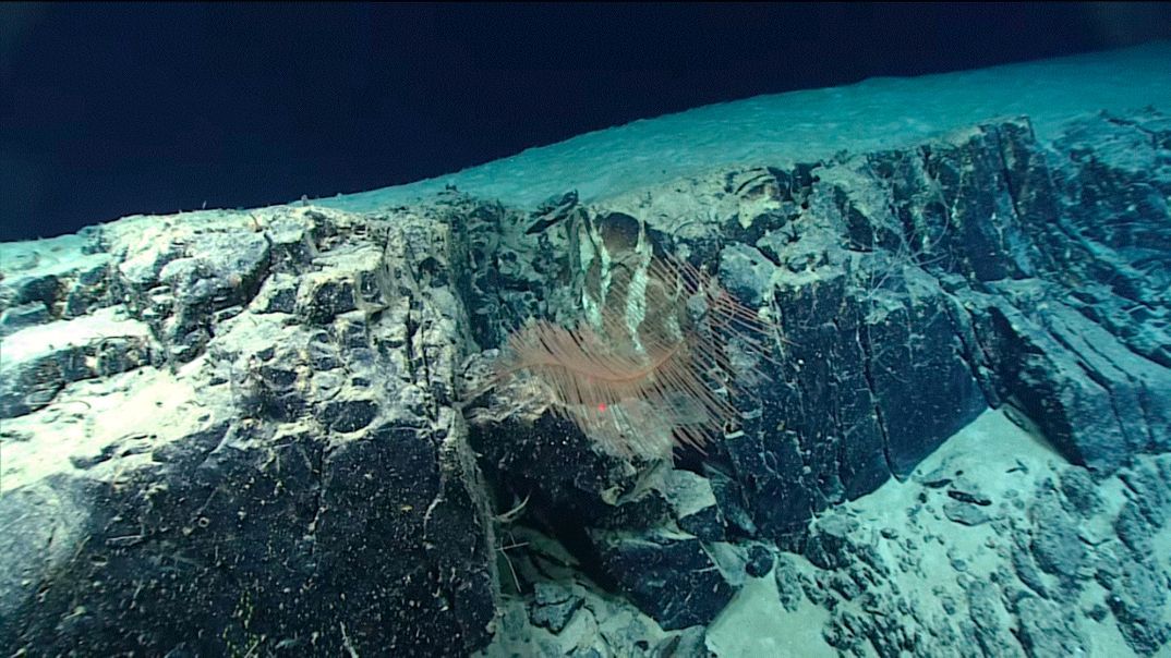 Nedávný videozáznam z ROV odhalil plochou magnetickou čedičovou geopolymerní plošinu odlitou na vrcholu východo-západního hřebenového prvku u "Západofloridského srázu", který se nyní nachází v hloubce 2 385 metrů pod hladinou moře.4 Zdá se, že rovinný, vertikální odlitek v černé vrstvě lze snadno odlišit od roztříštěného skalního podloží pod ním. Toto hřebenové chrámové naleziště (27,999° s. š. 86,418° z. d.), se nachází 6 704 kilometrů od Velké pyramidy, což představuje 26,93 % středního obvodu Země. Tato radiální vzdálenost je doplněna přesným umístěním na 29° severní šířky, což nabízí účinný příjem rezonance infrazvukových stojatých vln.