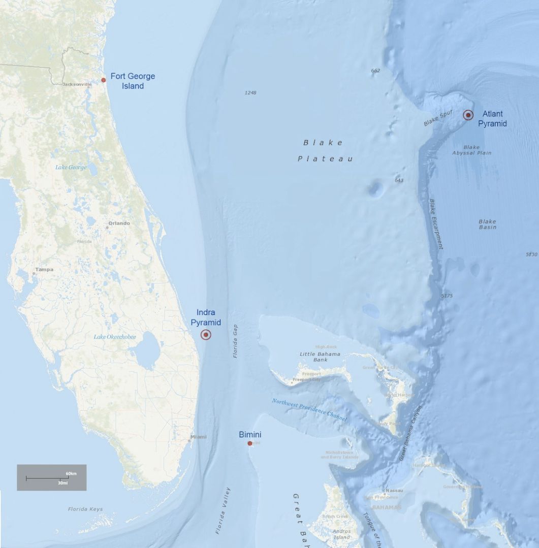 Předchozí výzkumy tohoto autora identifikovaly u východního pobřeží Floridy dvě velká ponořená atlantská pyramidová naleziště postavená v období pozdního paleolitu, kdy mnohem nižší hladina moře obnažovala celý kontinentální šelf. Pyramida Indrova zaujímá geopozici podél 27° severní šířky v blízkosti paleo-pobřežní linie, zatímco mnohem větší 1 525 metrů Atlantská pyramida se nachází poblíž 30° severní šířky, přičemž je z větší části pokryta hustou vrstvou vulkanických usazenin z doby první destrukce Atlanty ~52,3 00 př. n. l. Ostrov Fort George byl rovněž označen za příbuznou lokalitu, ke které se vážou neobvyklé události kolem kulovité kovové mimozemské sondy, která byla kdysi v držení rodiny Betzových a o níž se psalo v různých časopisech koncem března 1974. Obrovské paleo-pobřežní mohyly mušlí na Bahama Banks jsou tvořeny převážně obřími konžkami z hlubokomořských líhní, zatímco v současných mohylách mušlí na ostrově Anageda převažují královny mušlí, které se hojně vyskytují v mělkých vodách přístupných potápěčům (obr. níže).